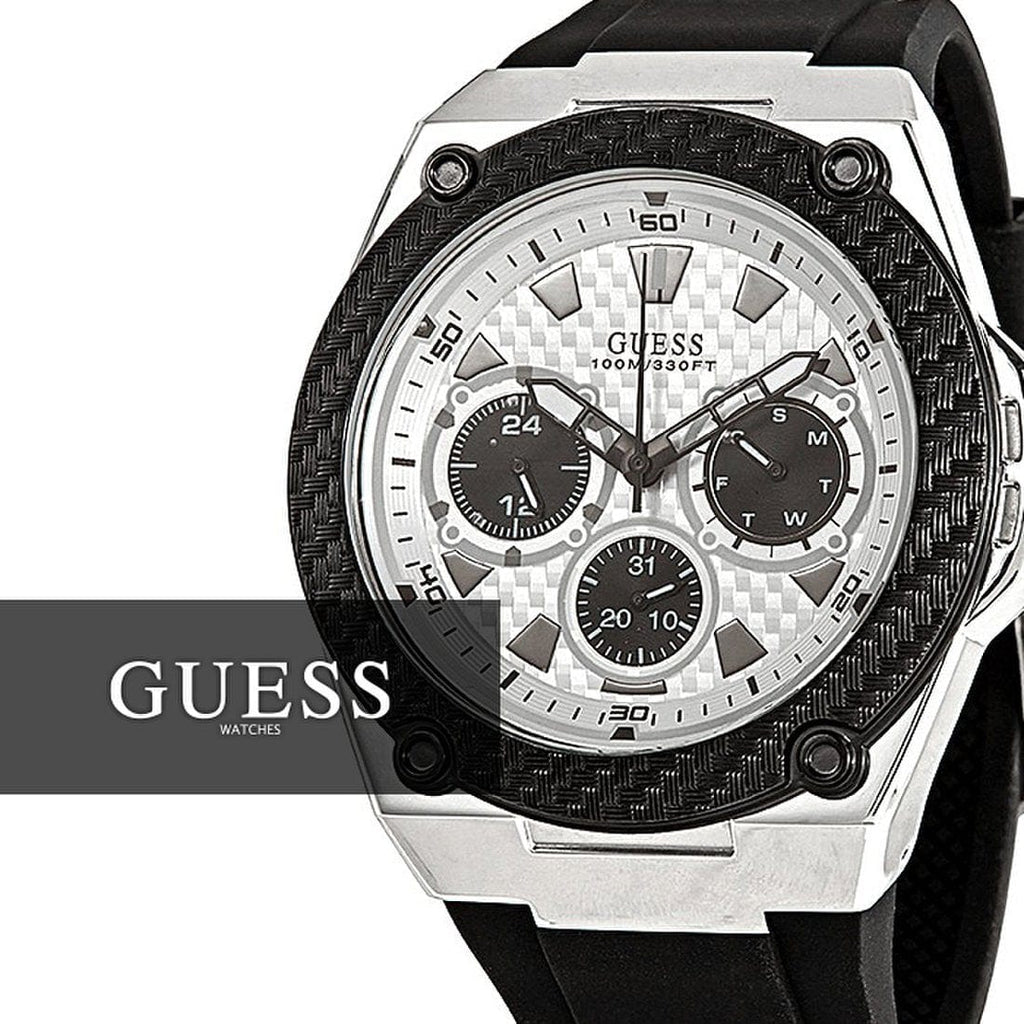 GUESS Legacy Men’s Watch Stainless steel case with a black rubber strap. Fixed black bezel. White dial with luminous black hands and index hour markers. Minute markers around the outer rim. It is shipped with its original box and official warranty card.