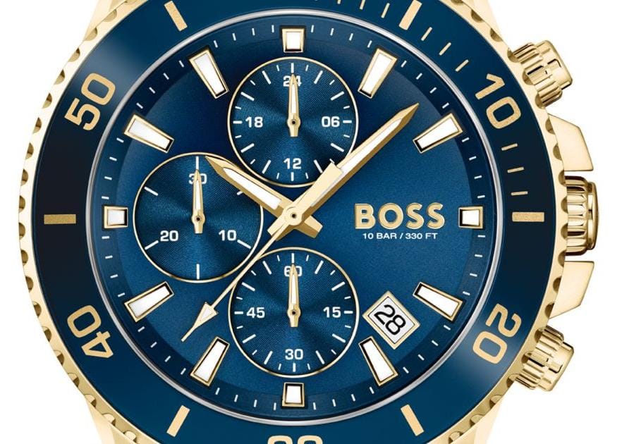 The BOSS Admiral Chronograph 1513965 is a stylish men's dive watch with a 46 mm wide and 11.95 mm thick stainless steel case in gold-tone. This model features a blue silicone bracelet with a width of 22 mm at the attachment point and features a Valjoux dial chronograph and date display.