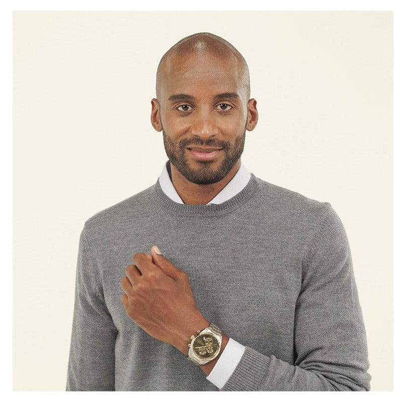 This BOSS Grand Prix mens chronograph watch is crafted from stainless steel with a yellow gold plating, and powered by a quartz movement. Presented on a stainless steel bracelet, the watch is finished with a green dial.