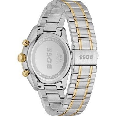 Sleek and sporty, this chronograph watch from BOSS is part of the the Grand Prix 44 family. It features a 44.5mm stainless steel case, signature branding and a date function at 4 o'clock. It is secured with a stainless steel bracelet strap and is water resistant to 5ATM.