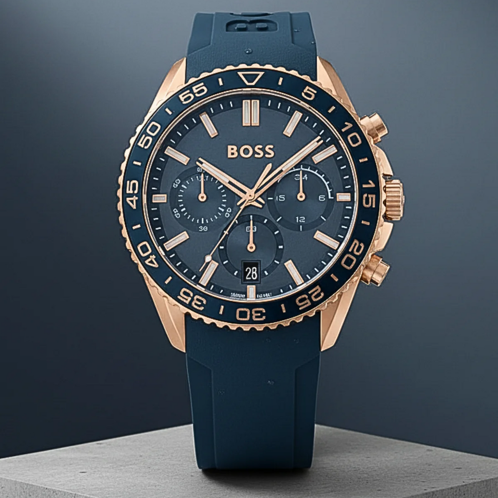 The Hugo Boss Runner Chronograph combines sporty sophistication with everyday versatility. Featuring a striking blue dial and matching silicone strap, this chronograph watch delivers both style and functionality for the modern man. The precision chronograph movement tracks your moments with accuracy, while the durable silicone construction ensures comfort during workouts or casual wear. With its bold design and reliable performance, this timepiece seamlessly transitions from the gym to the office, making it an essential addition to any watch collection.