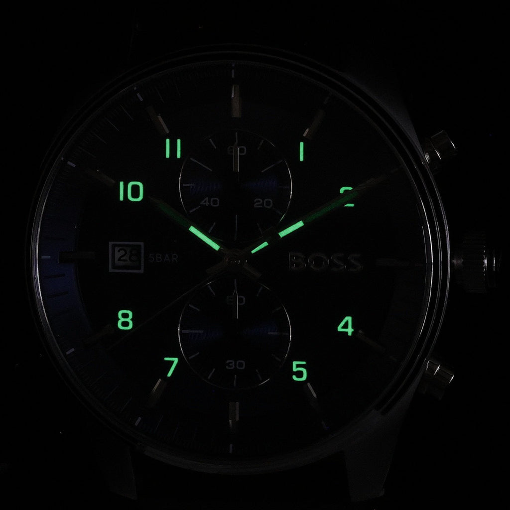 The Hugo Boss Skytraveller 1514194 Chronograph watch blends sophistication with practicality, featuring a 44mm silver stainless steel case and a rich brown leather strap. Its dark blue sunray dial with silver accents not only enhances readability but also adds a touch of elegance to its design. Powered by a precise quartz chronograph movement, it offers accurate timekeeping and stopwatch functionality. The mineral crystal protects the dial from scratches, ensuring durability and clarity.