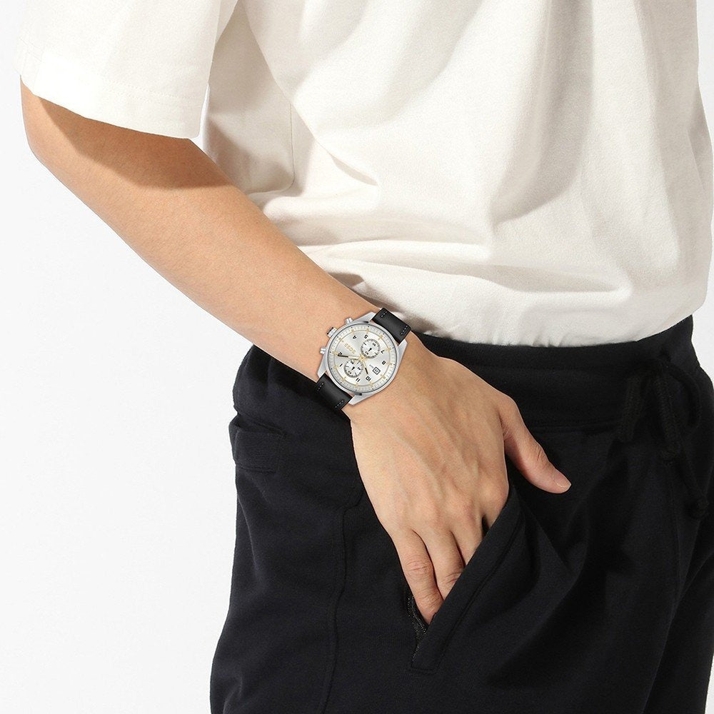 Hugo Boss Skytraveller Chronograph Silver Dial Black Leather Strap Watch for Men - 1514147