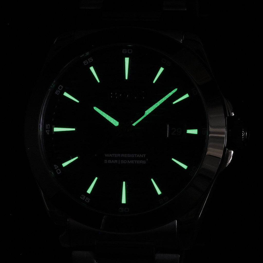 This Hugo Boss watch has a 41mm stainless steel case and a stainless steel bracelet. The case houses a Seiko Instruments Inc. movement, and the watch features a mineral crystal.