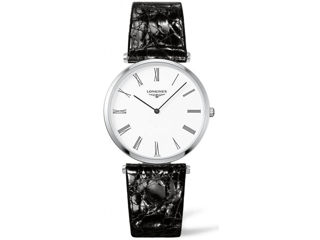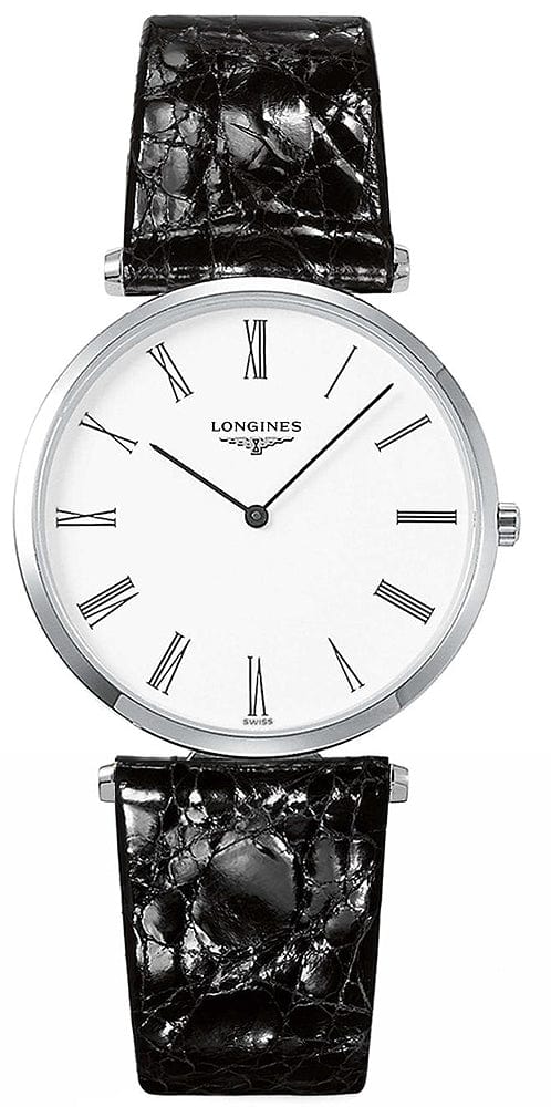 Brand New Authentic Longines La Grande Classique Quartz Leather Strap Men's Watch Model L4.755.4.11.2. Stainless Steel case with Black Alligator/Crocodile Leather strap. Tang clasp. Fixed bezel. Dial description: Black Hands and Roman numeral Hour Markers on a White dial. Quartz movement. Watch functions: Hour, Minute. Push In crown. Scratch Resistant Sapphire crystal. Round case shape. Case size: 36mm. Solid case back. 30 Meters - 100 Feet water resistant.