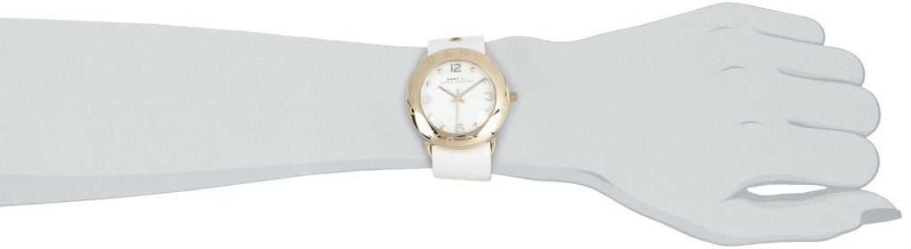 Gold-tone stainless steel case with a white leather strap. Fixed gold-tone bezel. White dial with gold-tone hands and dot hour markers. Arabic numerals mark the 3, 6, 9 and 12 o'clock positions. Dial Type: Analog. Quartz movement. Scratch resistant mineral crystal. Pull / push crown. Solid case back. Case size: 36 mm. Case thickness: 9 mm. Round case shape. Band width: 18 mm. Band length: 8.5 inches. Tang clasp. Water resistant at 50 meters / 165 feet. Functions: hour, minute, second. Casual watch style. Marc by Marc Jacobs Amy White Dial Gold-tone White Leather Ladies Watch MBM1150.