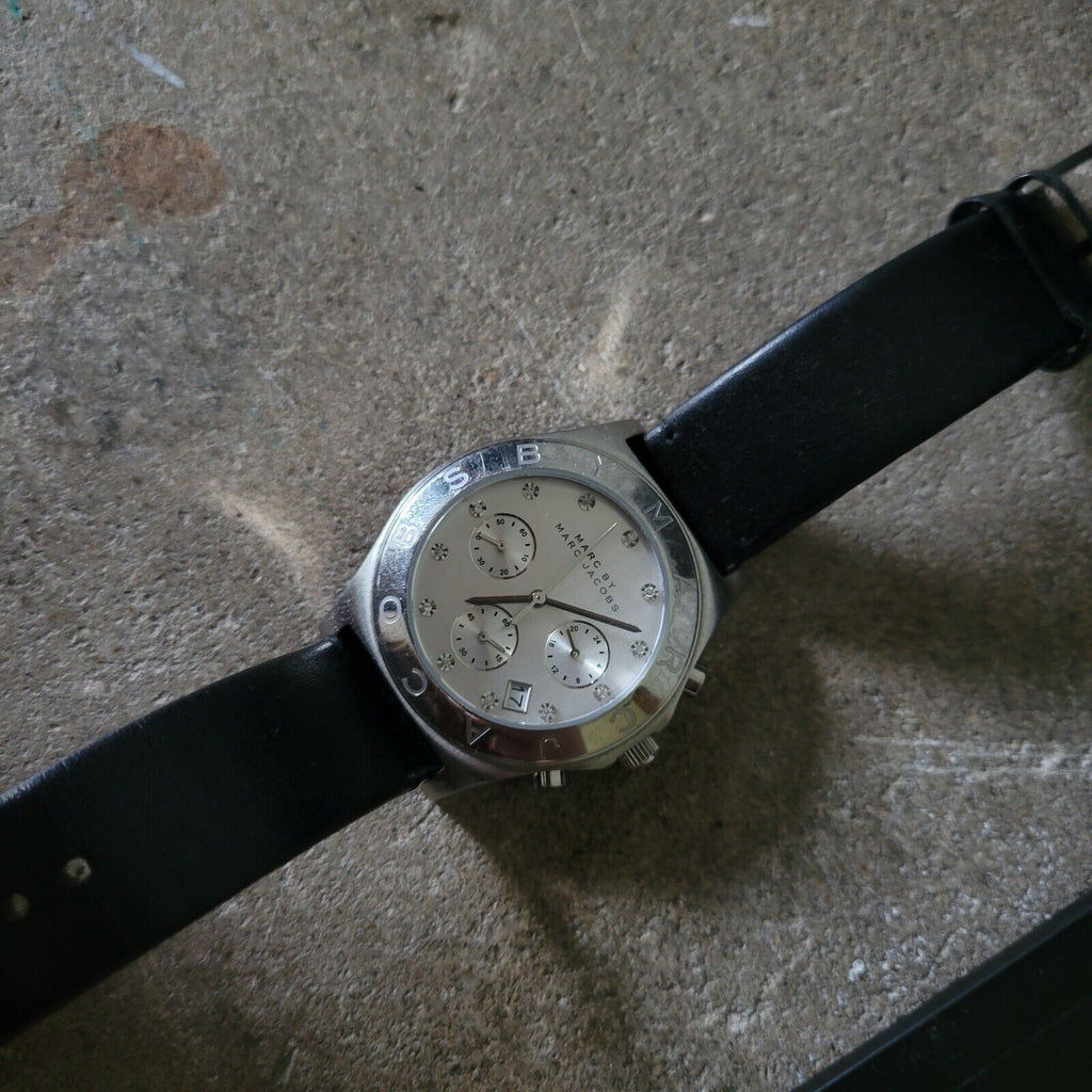 Elevate your style with the Marc Jacobs Blade Chronograph White Dial Black Leather Strap Watch for Women! This sleek and sophisticated timepiece features a white dial, black leather strap, and reliable chronograph function. Make a bold statement with this watch that seamlessly blends fashion and function.