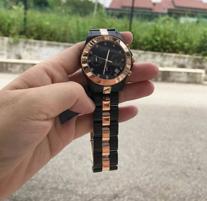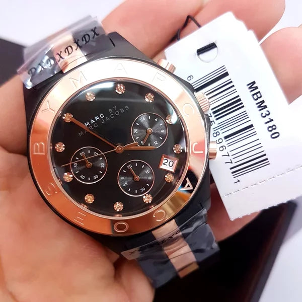 A beautiful Ladies Marc By Marc Jacobs MBM3180 Blade watch in black ion and rose plated stainless steel. This stylish wrist watch has a black dial and comes with a date function, chronograph and sparkling stone hour markers. It is powered by a quality quartz movement and fastens with a two tone stainless steel bracelet. Presented in a signature Marc By Marc Jacobs watch gift box.| INFORMATION | |