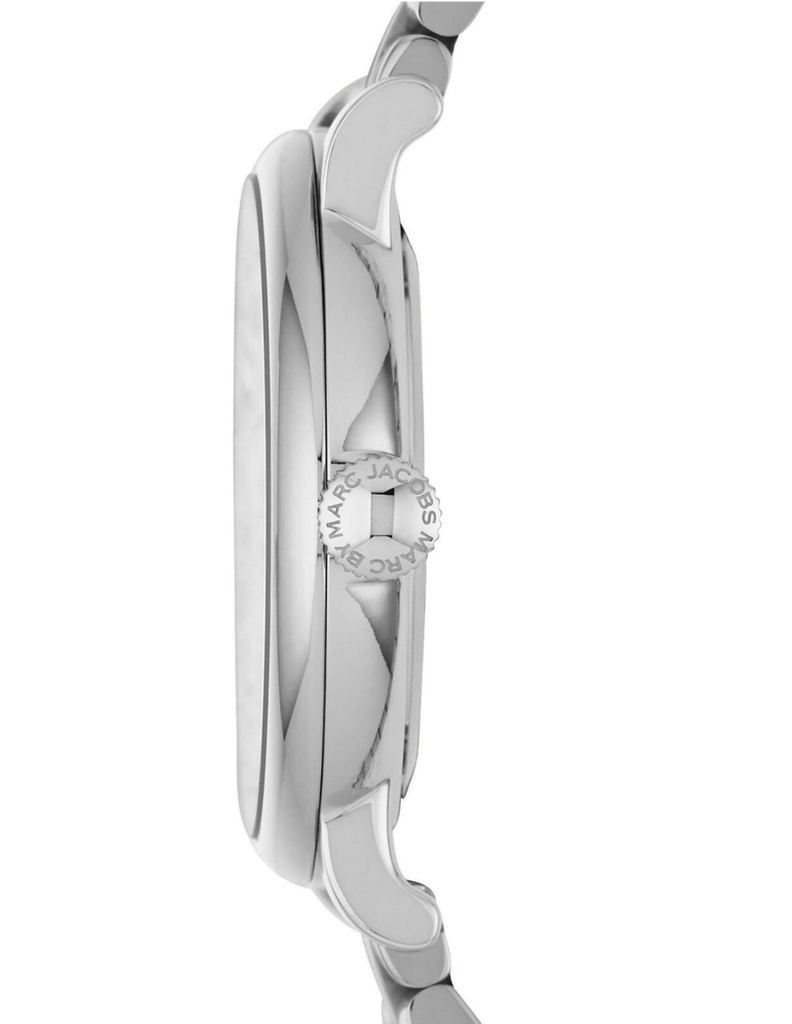 Stainless steel case with a stainless steel bracelet. Fixed stainless steel bezel. Silver sunray dial with silver-tone hands and index hour markers. An Arabic numeral appears at the 12 o'clock position. Dial Type: Analog. Quartz movement. Scratch resistant mineral crystal. Pull / push crown. Solid case back. Case diameter: 26 mm. Case thickness: 7 mm. Round case shape. Band width: 14 mm. Deployment clasp. Water resistant at 50 meters / 165 feet. Functions: hour, minute, second. Casual watch style. Marc By Marc Jacobs Peggy Silver Sunray Dial Stainless Steel Ladies Watch MBM3404.Material & Measurements