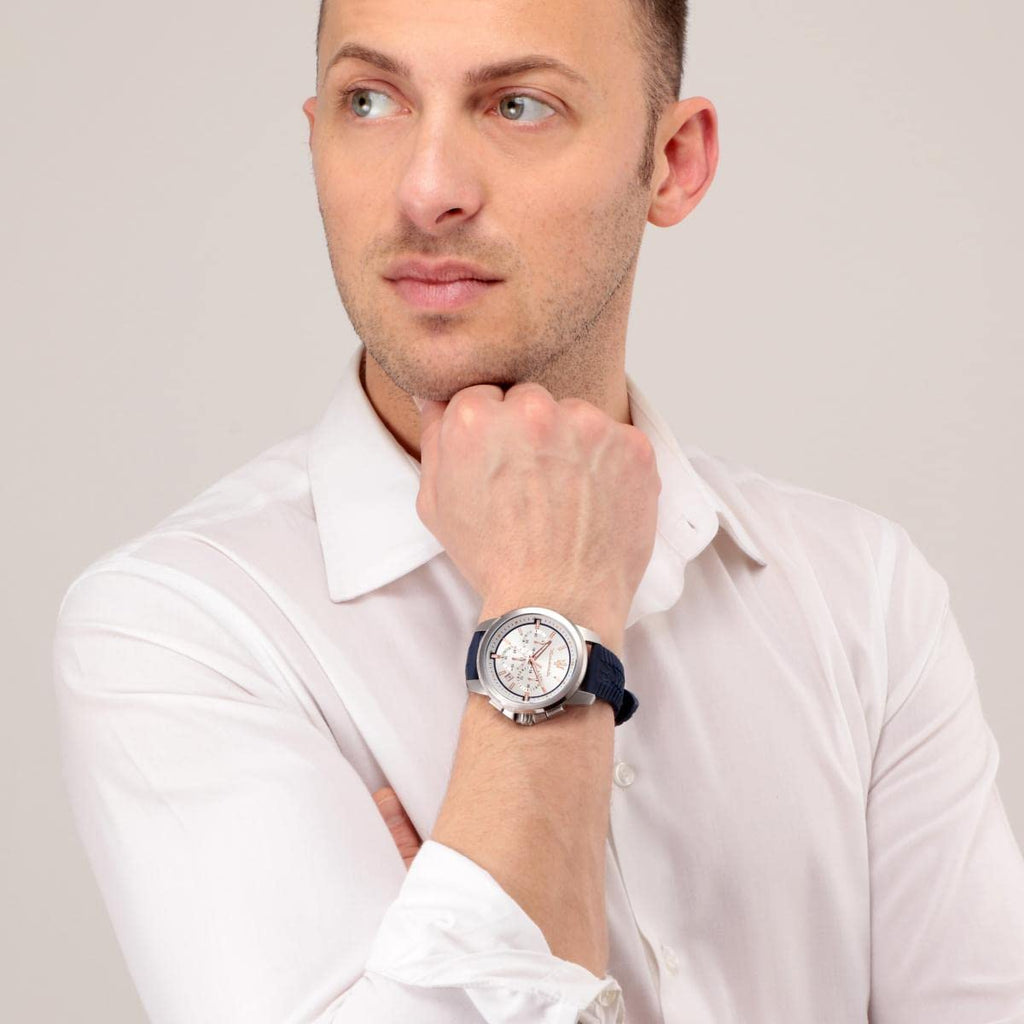 Maserati Successo Chronograph R8871621013 is one of the best examples of men's fashion watches. The heart of the watch is an extremely accurate and battery-powered quartz movement. The durable silver case of the watch is made of stainless steel.The navy blue silicone strap is characterised by high flexibility and damage resistance. It perfectly matches the watch case. The silver dial is protected against shocks and scratches by a mineral crystal. The watch has a water resistance of 50 meters, which means it can be worn while you are in the shower or bath. Maserati R8871621013 is an authentic watch from an authorised dealer. The product is covered by the manufacturer's warranty and is packed in the original box.