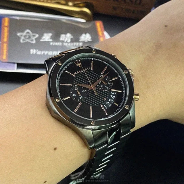 The new Maserati Circuito collection plays with clean and well-defined geometry. This watch is characterised by the elegant contrast between the Black colouring of the bezel and the Rose Gold colour of the Steel case and screws. The play on colours is reflected by the chronograph and details on the dial, and the bracelet matches the darker colour in the centre. Screw-down crown and back, Water Resistant 10 ATM.