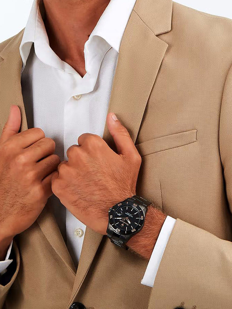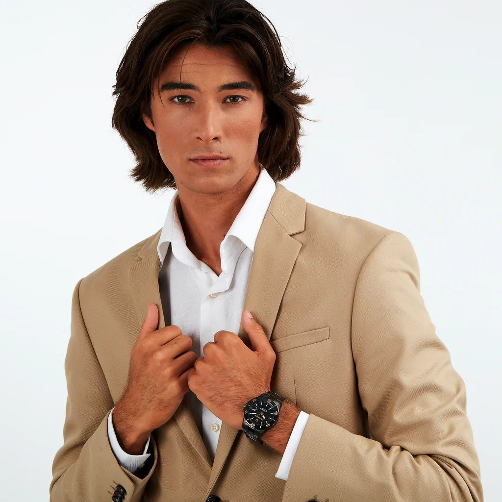 The Maserati Competizione R8853100035 men's watch operates on a Miyota 2315 Japanese quartz movement. The black PVD-coated envelope houses a black dial complemented by a magnifying glass day-of-the-month date stamp and luminescent coating on the indexes and hands. The model features a ceramic rotating bezel. Water resistance is estimated at 10 ATM.