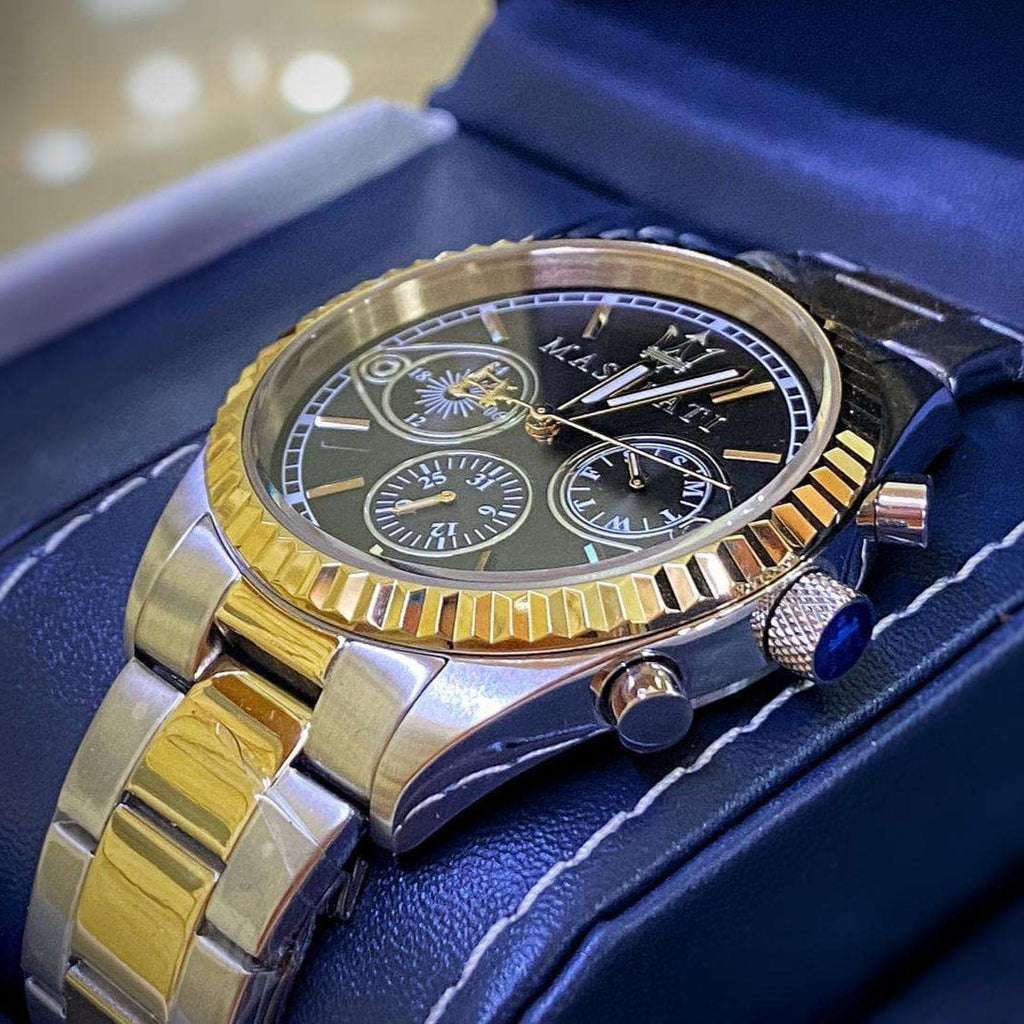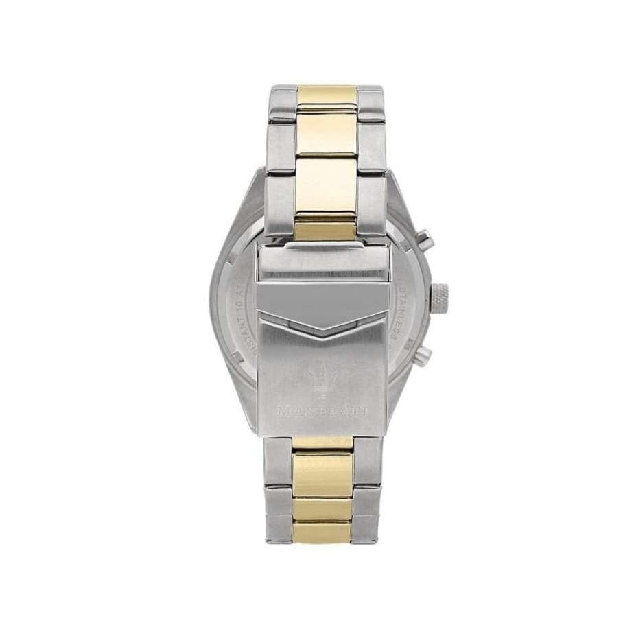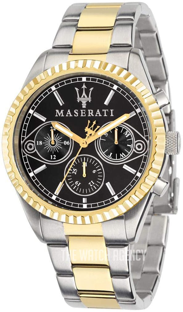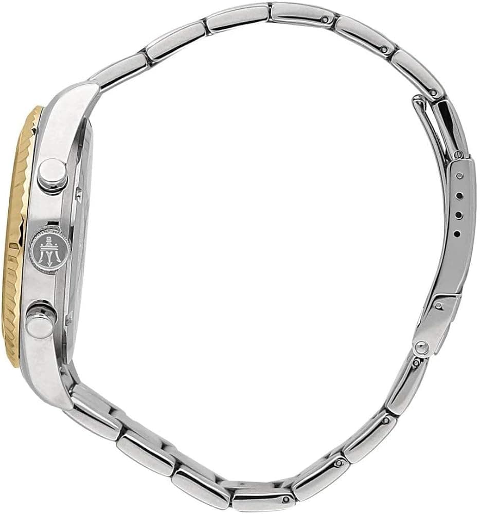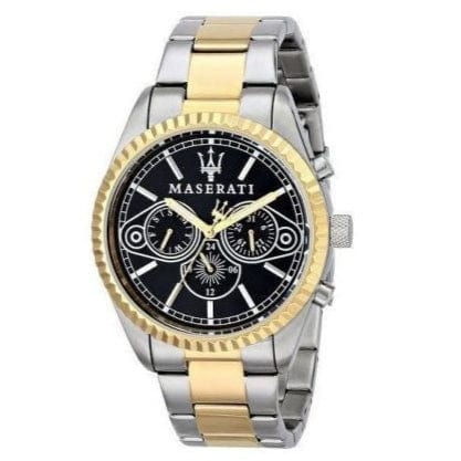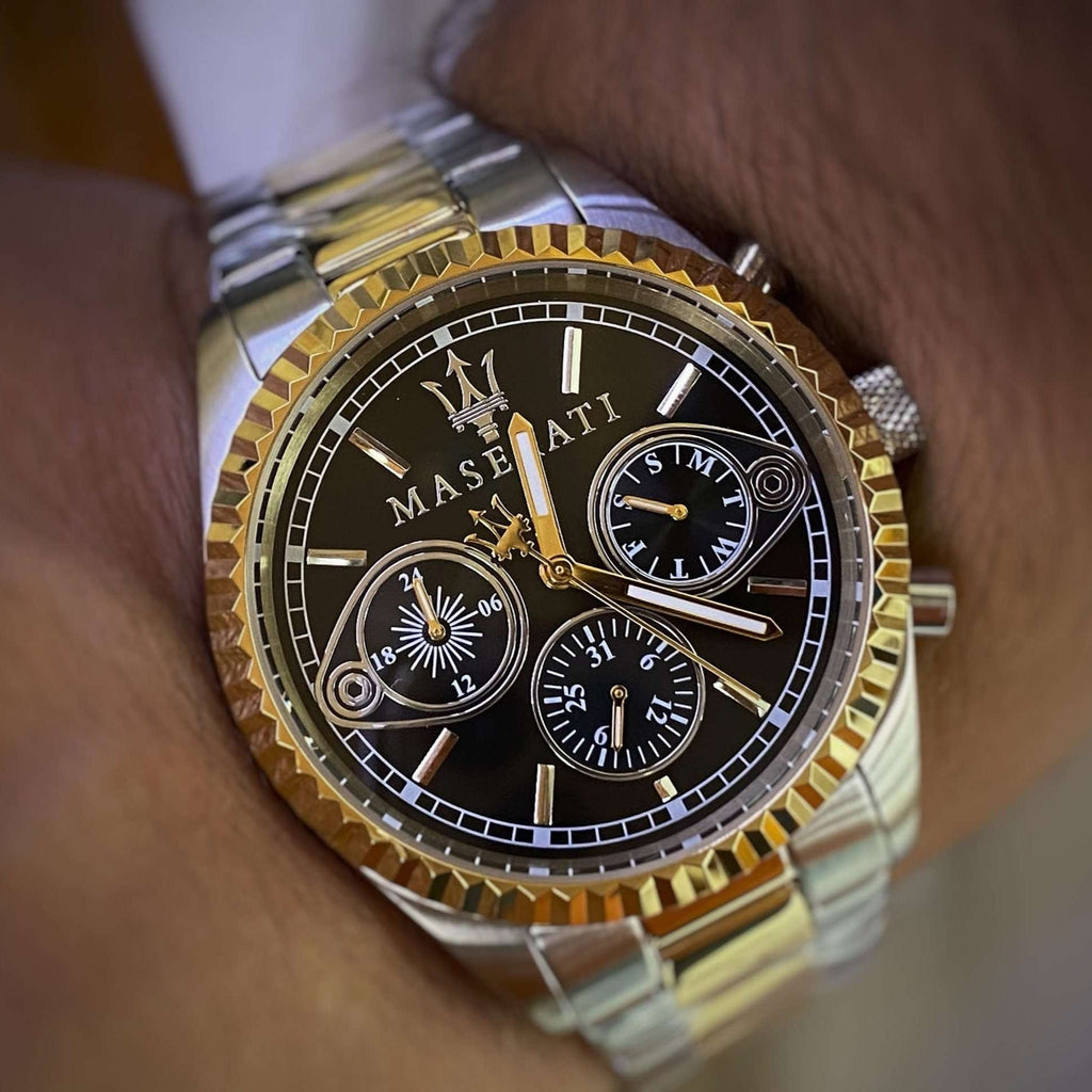 Elevate your style with the Maserati Competizione Chronograph Watch. Featuring a sleek two-tone steel strap, this watch exudes sophistication. With a bold black dial and precise chronograph function, this watch is not only stylish but functional as well. Make a statement with Maserati.