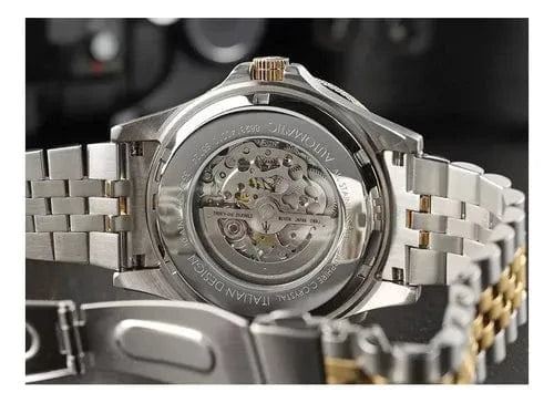 Experience the luxury and precision of the Maserati SFIDA Automatic Skeleton Black Dial Watch! This sophisticated timepiece features a sleek black dial and two-tone steel strap, exuding style and elegance. With automatic movement and a skeleton design, you can admire the inner workings of the watch while enjoying the convenience of not needing a battery. Elevate your style with this stunning watch that combines form and function seamlessly.