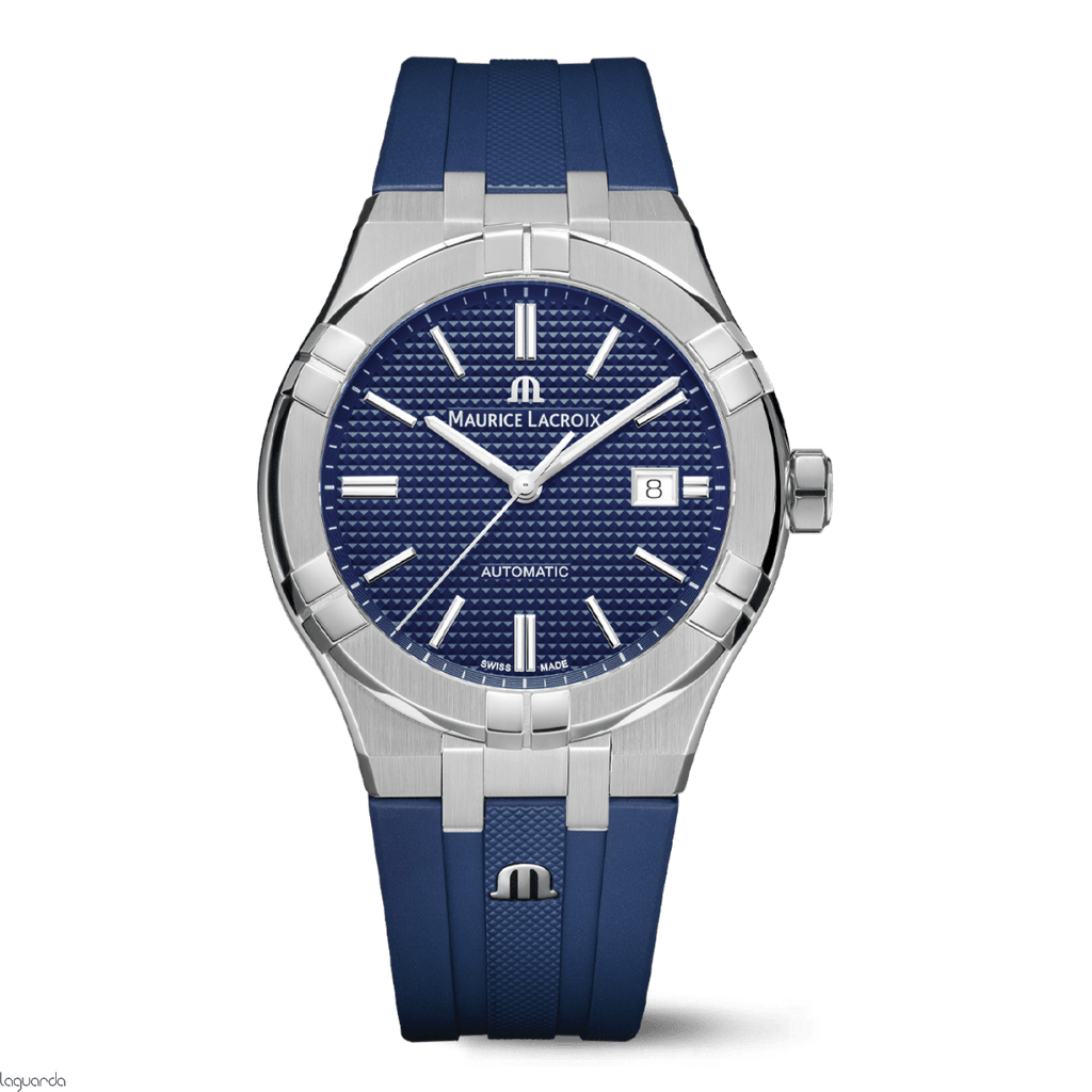 Manufacturer: Maurice Lacroix Model: AI6008-SS000-430-4 Series: Aikon Type: Men's watch, dress watch Diameter: Ø 42.00 mm Case: Brushed/polished steel Back case rear: Scratch-proof sapphire crystal Bracelet: Blue rubber Dial: Blue with index markings, luminescent hands Buckle: Tang type buckle made of steel Glass: Scratch-proof sapphire crystal Bezel: Steel, brushed/polished Movement & FunctionsMovement type: Automatic winding Seconds hand: Floating Movement: With 26 jewels, 28800 vph Power reserve: 38 hours Date: Date