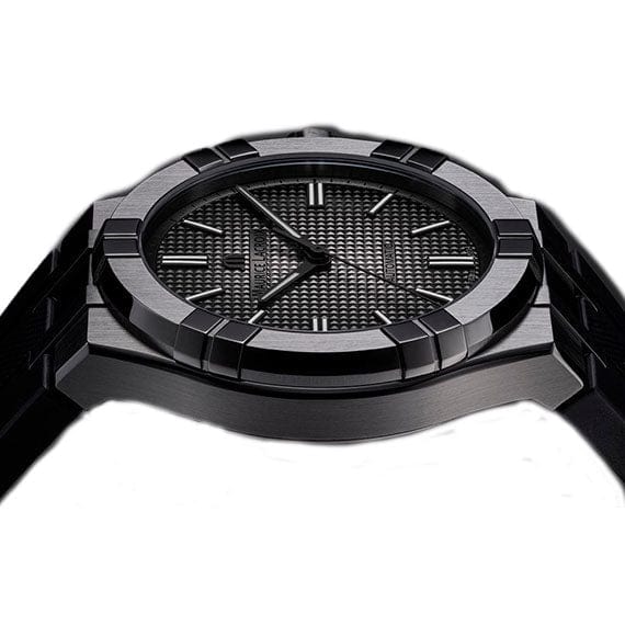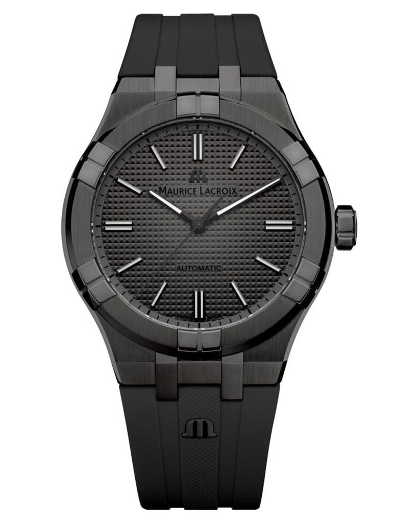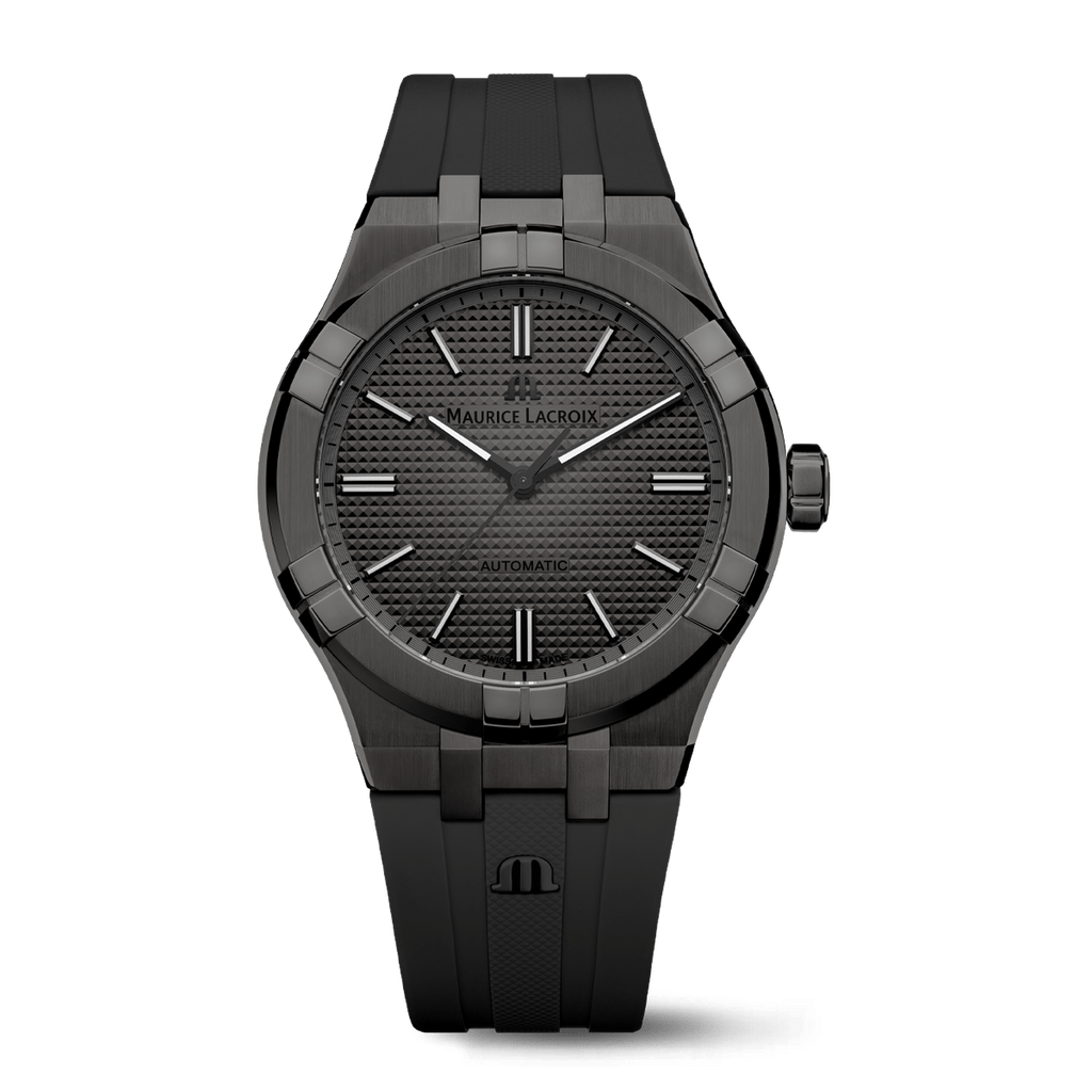 Maurice Lacroix Aikon Automatic Limited Edition 42 mm watch. Model reference: AI6008-PVB00-330-2. Stainless steel case with black PVD plated. Black dial. Automatic movement. Black rubber strap. Swiss made.