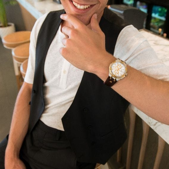 Elevate your style with the Maurice Lacroix Aikon Chronograph watch. Its sleek white dial complements the brown leather strap, bringing sophistication to any outfit. Stay on time with its precise chronograph function. Experience luxury and precision in one timepiece.