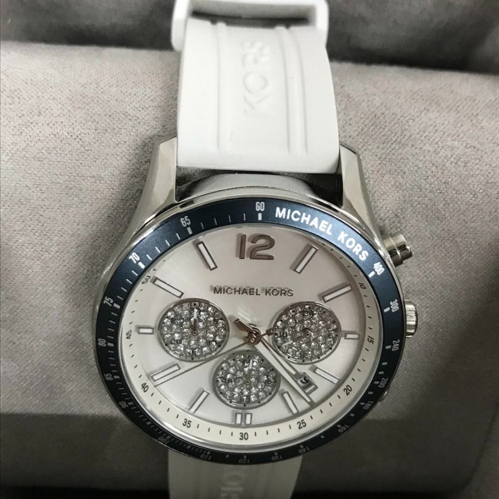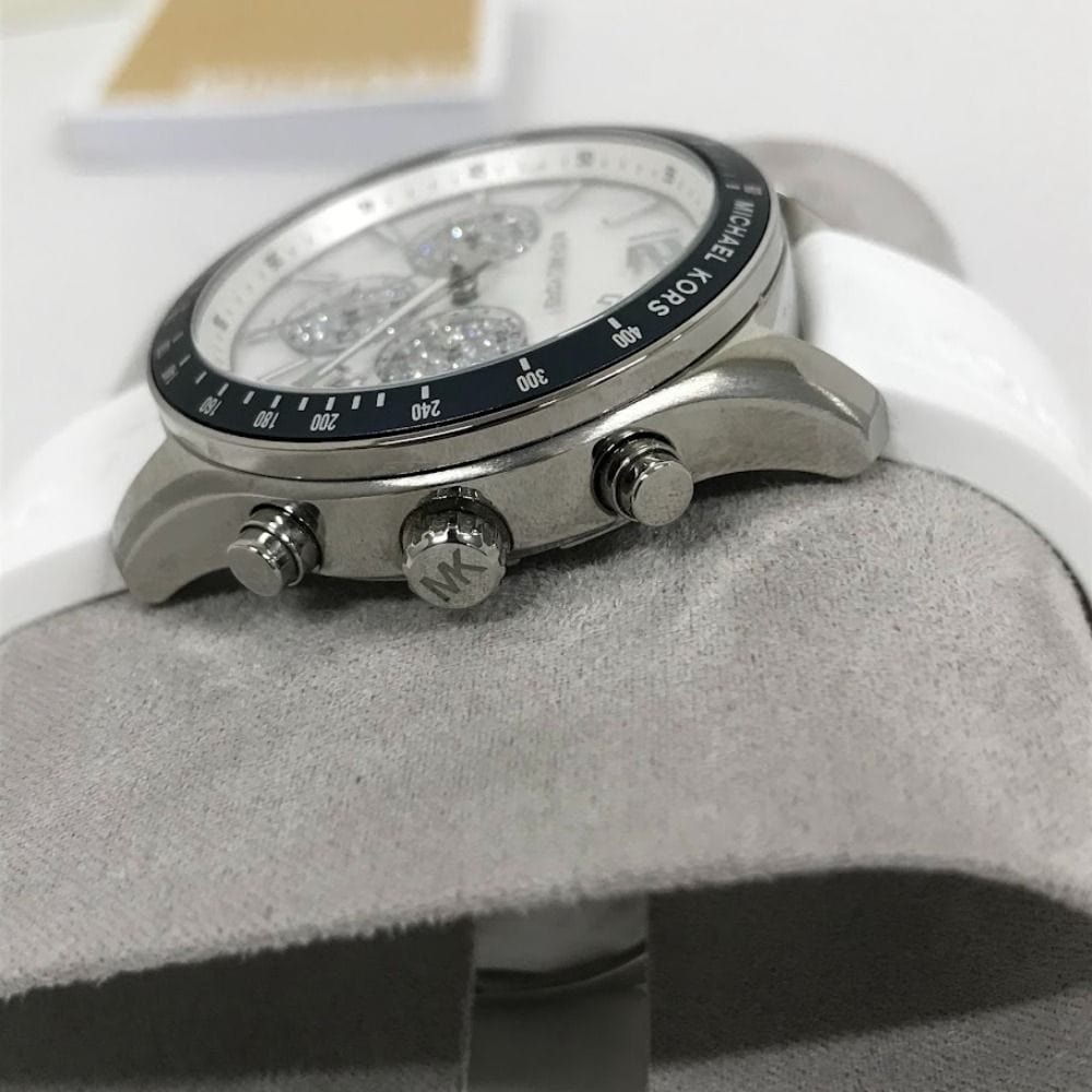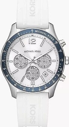 Experience luxurious style with the Michael Kors Berkley Chronograph Silver Dial Watch for Women - MKO1040. Featuring a sleek silver dial, this watch is complemented by a stylish white rubber strap. Stay on time and make a statement with this stunning timepiece.