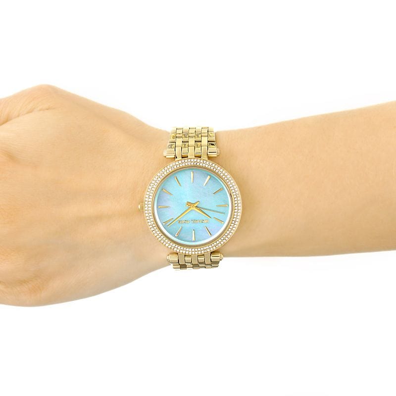The Womens Michael Kors Watch Darci (Darci MK3498) features a gold plated stainless steel bracelet strap, a gold plated stainless steel case and has a turquoise with three hand movement dial. The Darci MK3498 comes with an official Michael Kors Watches 2 year guarantee.