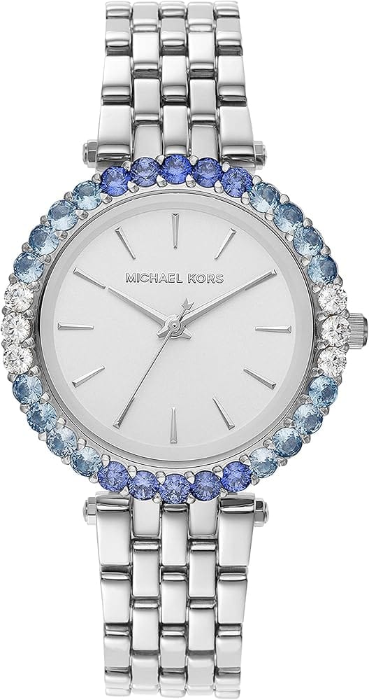 Elevate your look with the Michael Kors, a glamorous analog watch accented with rose-gold tone. A oversized blue pavé-embellished bezel lends look-at-me flair, while the radiant a silver sunray dial with stick indexes and a stainless steel bracelet renders this timepiece exceptionally elegant. It is a refine addition to your everyday look.