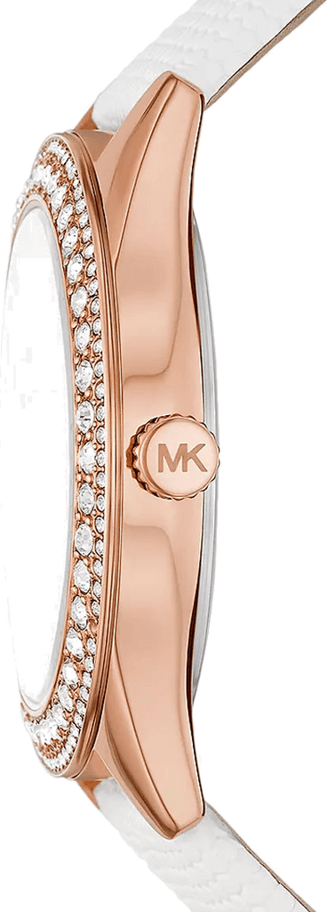 Michael Kors' 38mm Harlowe watch features a rose gold-tone pavé textured dial, pavé topring, three-hand movement and white lizard strap.