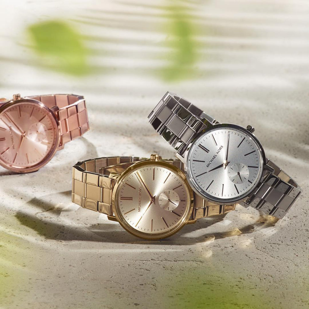 Sleek and chic, the monochromatic gold-tone Michael Kors Jaryn watch exudes Jet-Set style.