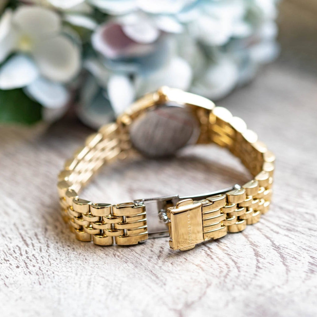 - The watch is scured using a gold-tone stainless steel bracelet.