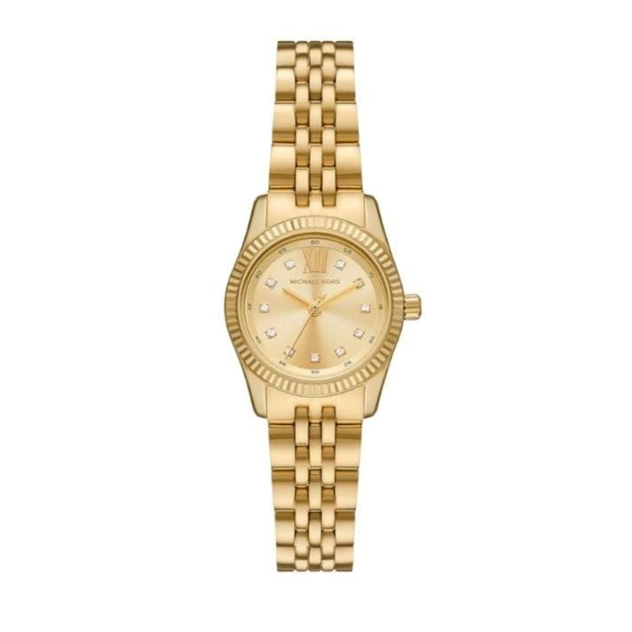 Discover the Michael Kors Petite Lexington Dames Horloge Watch, model number MK4741, a choice for ladies. Showcasing a 26mm stainless steel gold case, a coordinating gold dial, and a matching bracelet. Powered by a precise quartz movement and boasting a water resistance of 50m.
