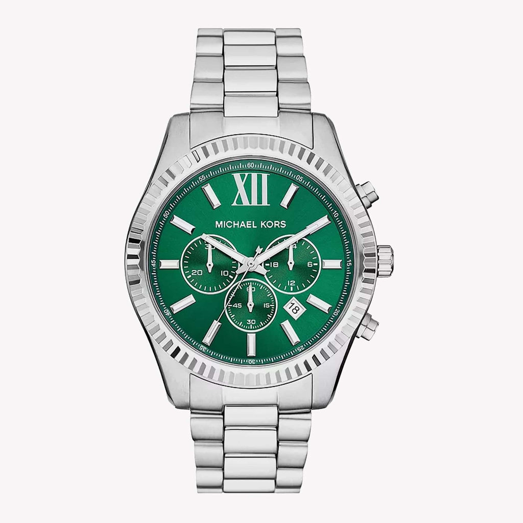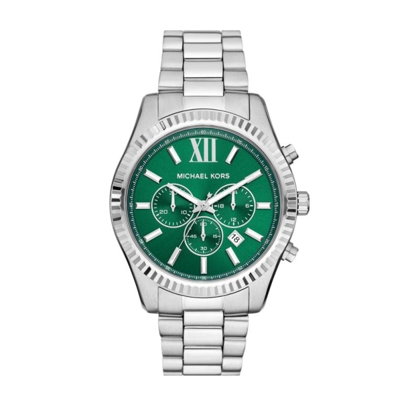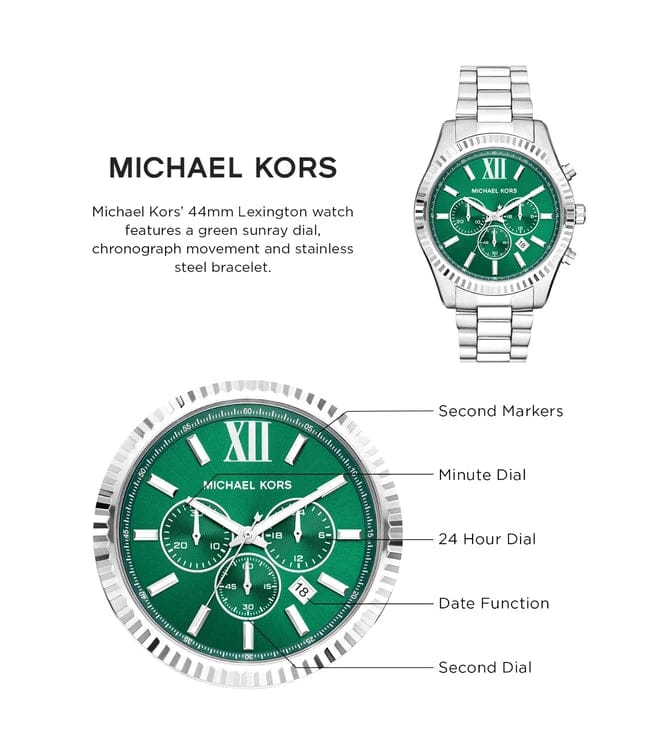 Michael Kors' 44mm Lexington watch features a green sunray dial, chronograph movement and stainless steel bracelet.