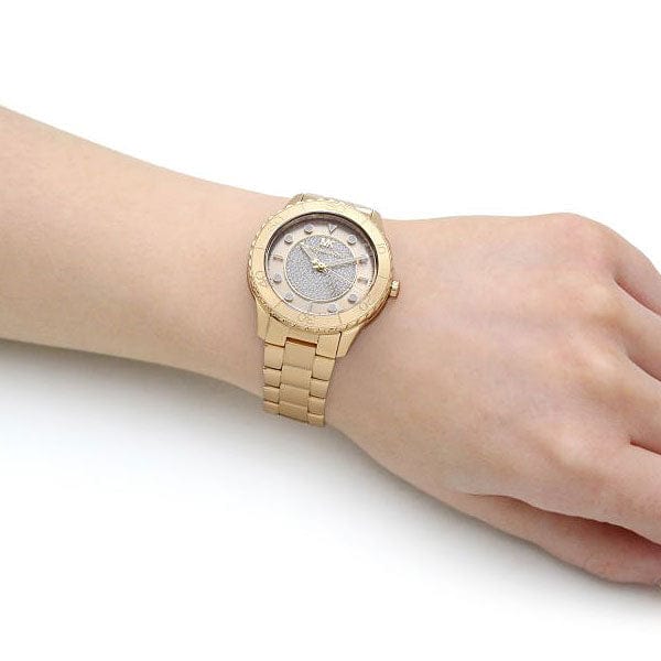 Gold-tone stainless steel case and bracelet. Fixed gold-tone bezel. Gold (crystal set) dial with lumiunious gold-tone hands and dot hour markers. Minute markers around the outer rim. Dial Type: Analog. Quartz movement. Scratch resistant mineral crystal. Pull / push crown. Solid case back. Round case shape.