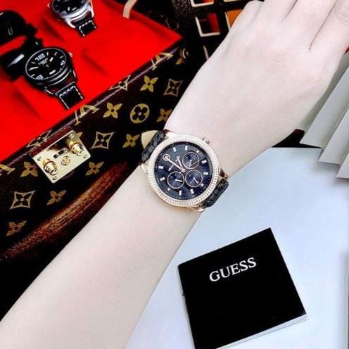 Imagine the captivating beauty of a rose gold-toned stainless steel case elegantly paired with a sleek black leather strap. This luxurious yet comfortable combination assures both durability and effortless style, complementing your attire with ease.