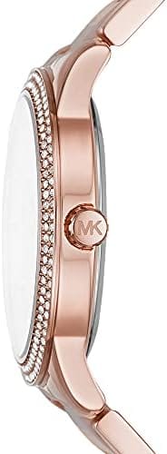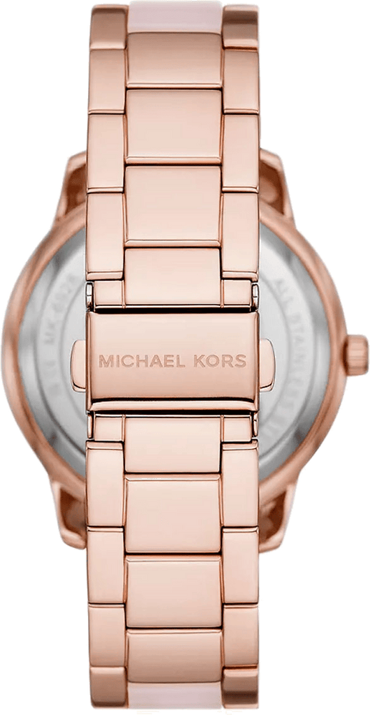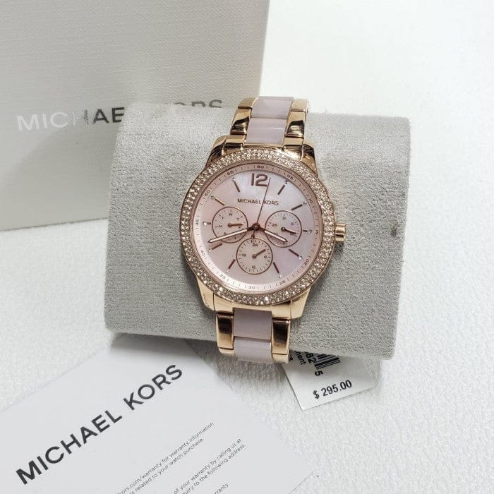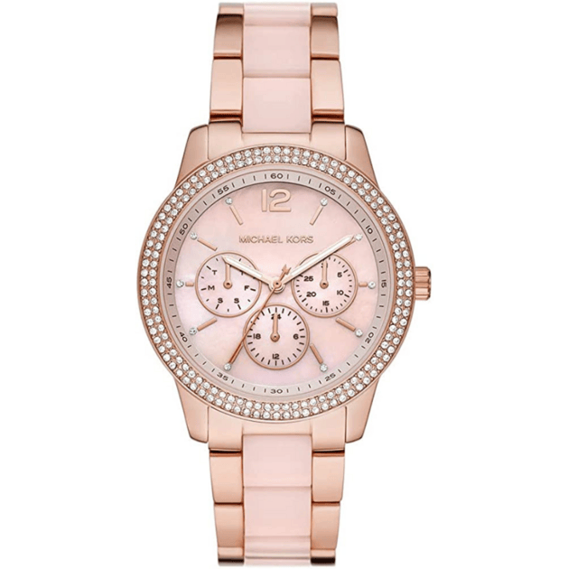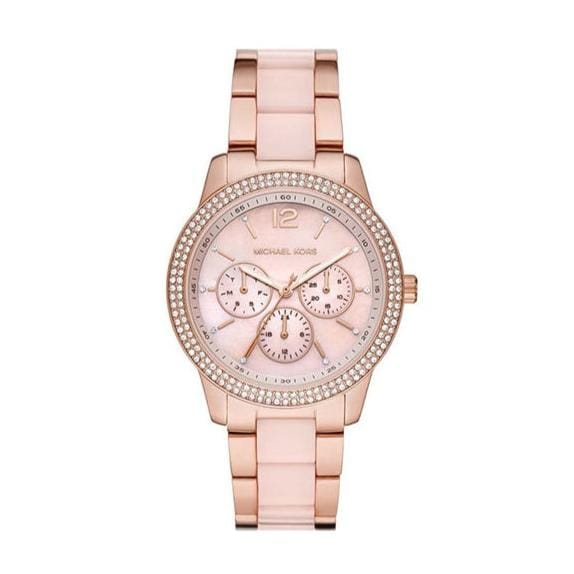 Michael kors' 40mm Tibby watch features a blush mother of pearl dial with rose-gold tone indexes, rose gold-tone case with a double pave topring, multifunction movement and rose-gold tone stainless steel bracelet with blush acetate centerlinks.