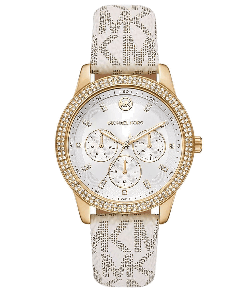 Elevate your style with the Michael Kors Tibby Multifunction Watch in white PVC. Combining luxury and functionality, this watch features a sleek design and multiple functions, including a date display and chronograph. Perfect for the modern woman who values both fashion and practicality.