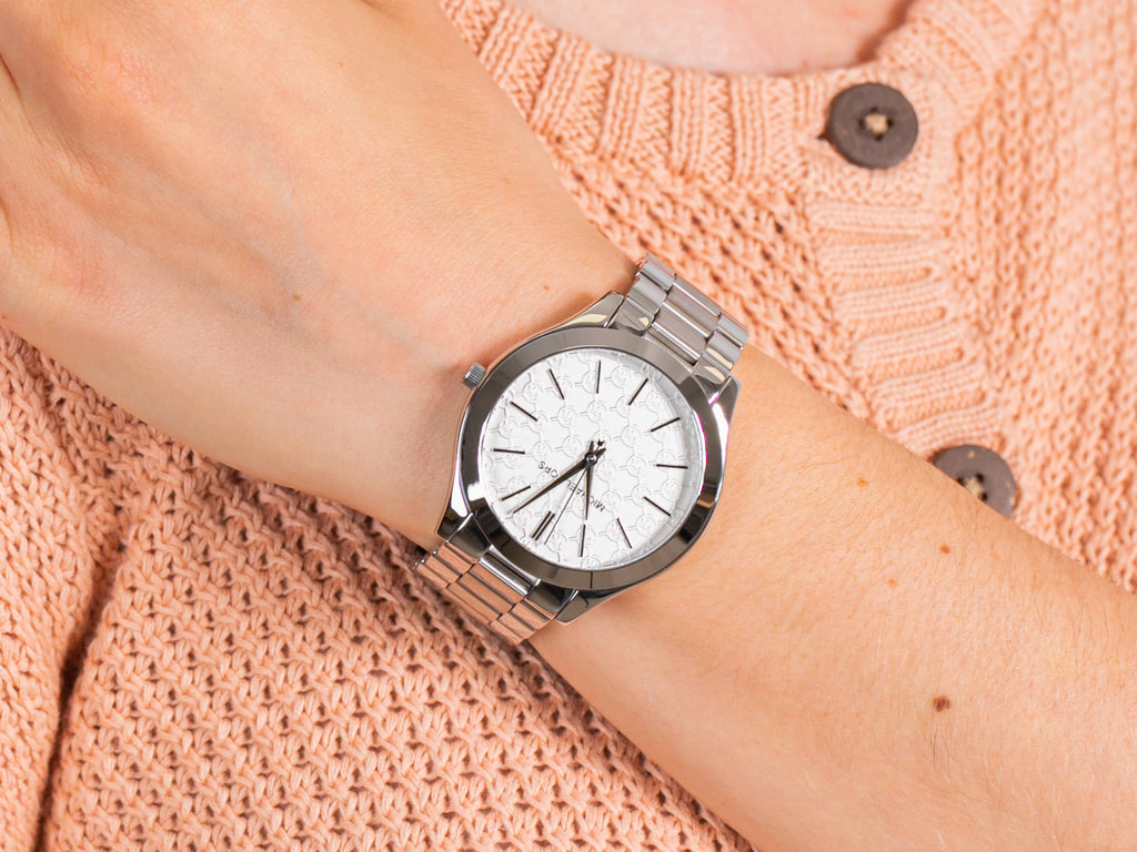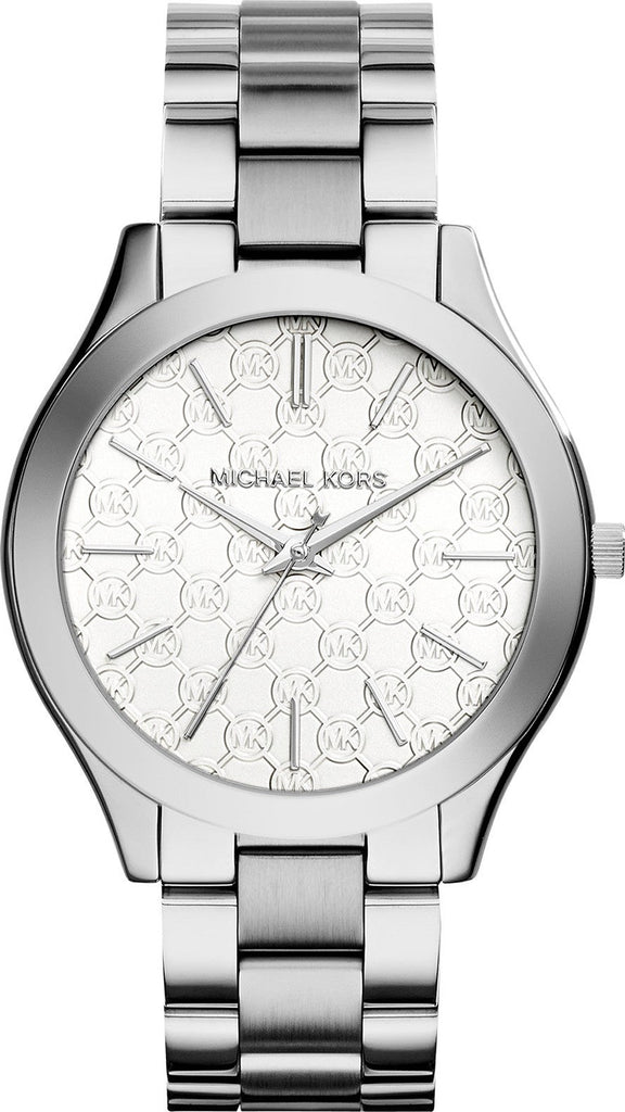 Stainless steel case with a stainless steel bracelet. Fixed stainless steel bezel. Silver dial with silver-tone hands and index hour markers. Dial Type: Analog. Quartz movement. Scratch resistant mineral crystal. Pull / push crown. Solid case back. Case diameter: 42 mm. Case thickness: 8.5 mm. Round case shape. Band width: 20 mm. Fold over clasp with push button release. Water resistant at 50 meters / 165 feet. Functions: hour, minute, second. Casual watch style. Michael Kors Runway Silver Dial Stainless Steel Ladies Watch MK3371.