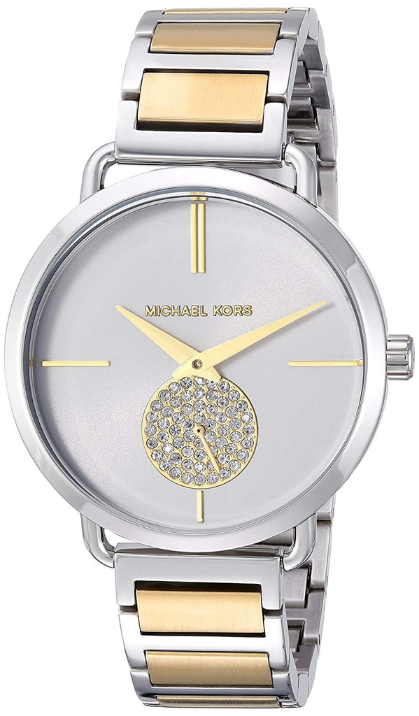 The Michael Kors Portia watch is the face of sleek, modern chic. A minimalist silver sunray dial with gold-tone stick indexes and pave crystal sixty-second sub-dial shines against a stainless-steel case and two-tone H-link bracelet.