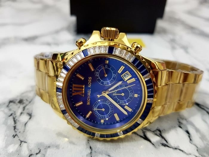 Gold-tone stainless steel case and bracelet. Fixed gold-tone bezel set with clear and navy baguette crystals. Navy dial with gold-tone hands and index hour markers. Roman numeral marks the 12 o'clock position. Minute markers around the outer rim. Dial Type: Analog. Luminescent hands and markers. Date display between 4 and 5 o'clock positions. Chronograph - three sub-dials displaying: 60 second, 60 minute and 24 hour. Quartz movement. Scratch resistant mineral crystal. Solid case back. Case diameter: 42 mm. Case thickness: 10 mm. Round case shape. Band width: 18 mm. Deployment clasp. Water resistant at 100 meters / 330 feet. Casual watch style. Michael Kors Everest Chronograph Navy Dial Gold-tone Watch MK5754