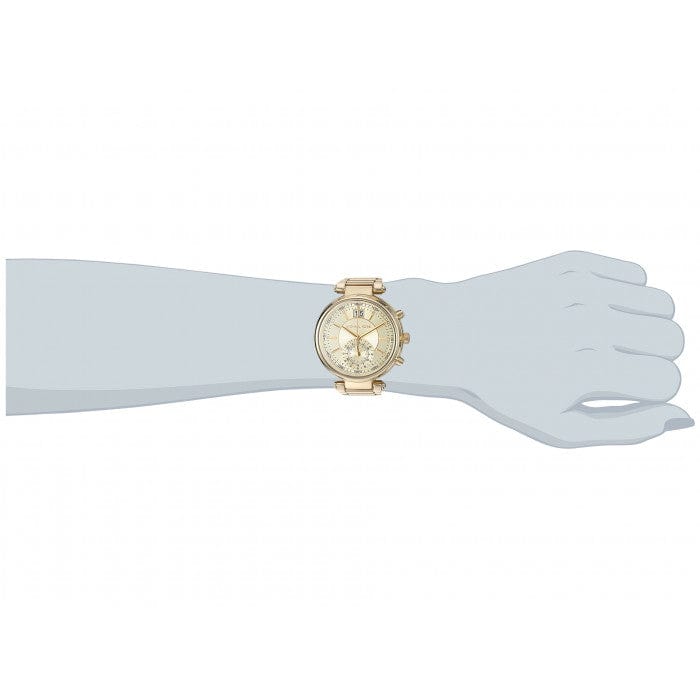 Gold-tone stainless steel case and bracelet. Fixed gold-tone bezel. Gold dial with gold-tone hands and crystal-tipped index hour markers. Minute markers around the outer rim. A single 12 hour / 30 minute sub-dial. Dial Type: Analog. Date display at the 12 o'clock position. Quartz movement. Scratch resistant mineral crystal. Solid case back. Case size: 39 mm. Case thickness: 11 mm. Round case shape. Band width: 19 mm. Deployment with push button release clasp. Water resistant at 50 meters / 165 feet. Functions: date, hour, minute, second. Additional Info: in general, suitable for swimming and snorkeling, but not diving. Dress watch style. Michael Kors Sawyer Gold Dial Ladies Watch MK6362.