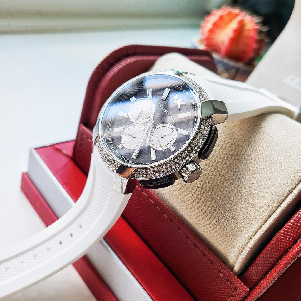 The moment your eyes land on this magnificently designed timepiece, will you definitely want to own it. Performance and style are boldly captured in this Michael Kors Sidney 42 mm watch which features a black logo dial with white and silver tone stick indexes. It is further accented with a pave topring, multifunction movement and white silicone strap.