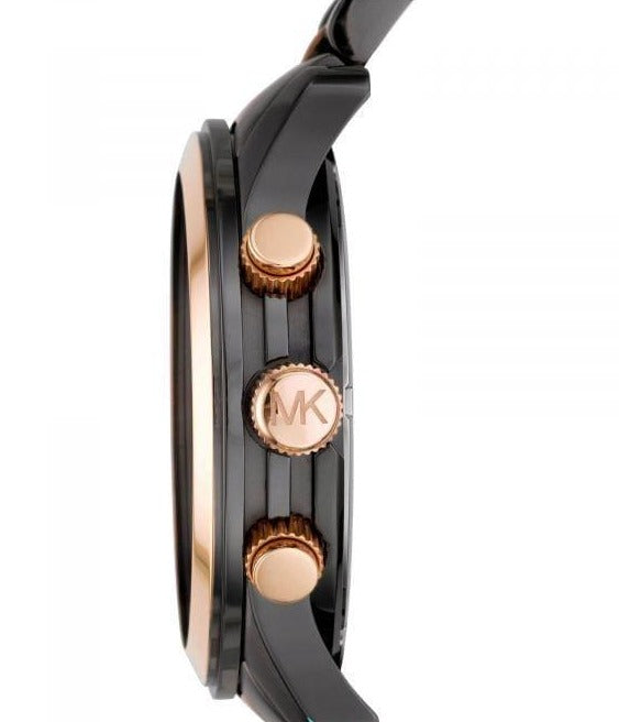 This Michael Kors Runway Chronograph Two-tone Unisex Watch MK8189 comes in stainless steel case with a two-tone (gunmetal and rose gold-tone) stainless s bracelet. Fixed rose gold-tone bezel. Black dial with luminous hands and alternating Arabic numeral and index hour markers. Minute markers around the outer rim. Dial Type: Analog. Luminescent hands. Date display between the 4 and 5 o'clock positions. Chronograph - three sub-dials displaying: 60 second, 60 minute and 12 hour. Quartz movement. Scratch resistant mineral crystal. Solid case back. Case diameter: 45 mm. Case thickness: 14 mm. Round case shape. Band width: 24 mm. Fold over clasp with double safety release. Water resistant at 100 meters / 330 feet. Functions: chronograph, date, hour, minute, second. Casual watch style.