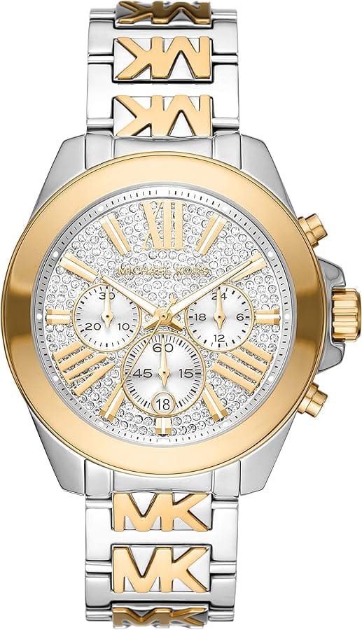 Michael Kors' 42mm Wren watch features a silver pavé dial, silver case with gold-tone topring, chronograph movement and two-tone stainless steel bracelet with gold-tone logo center links.