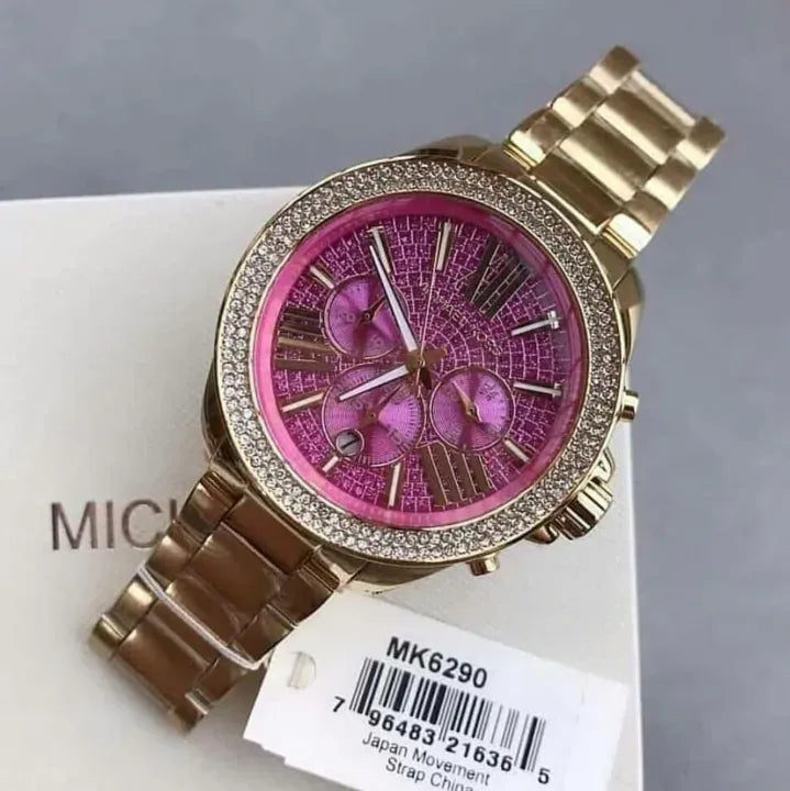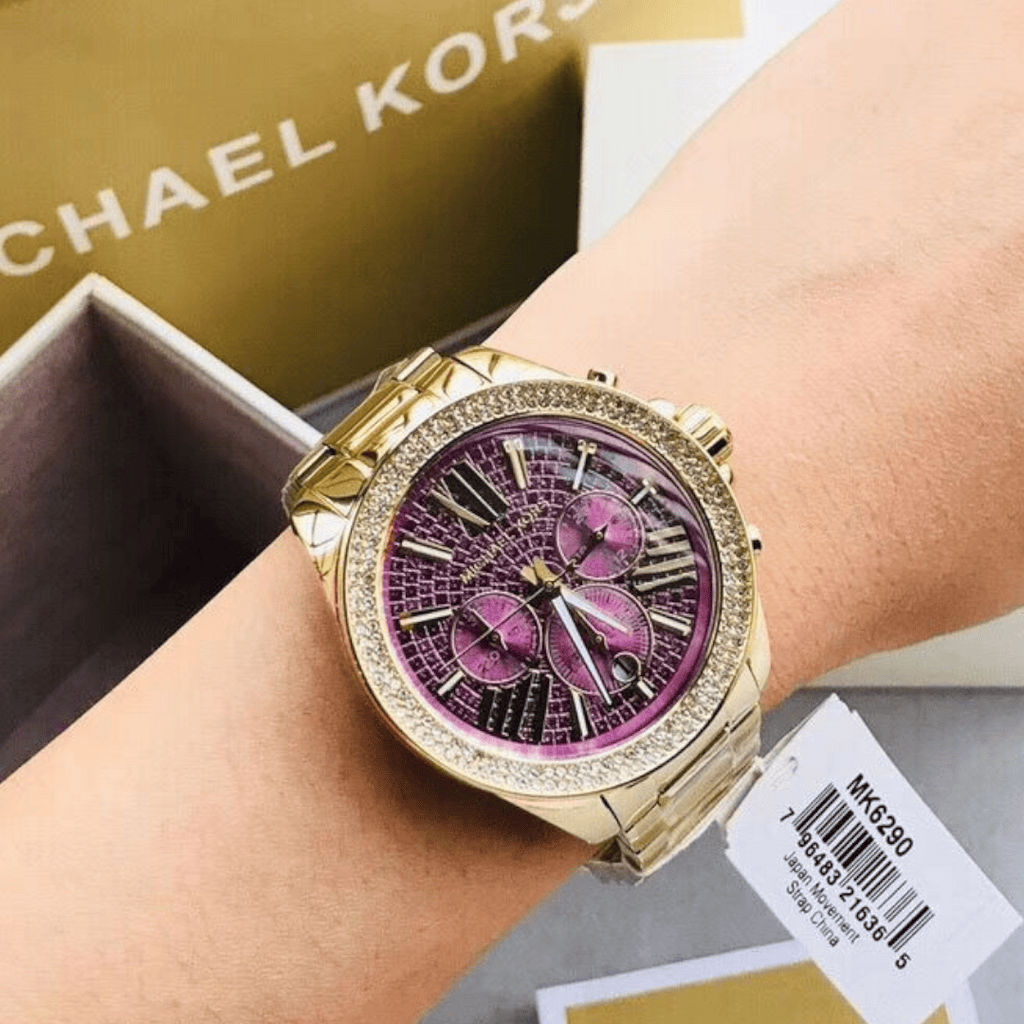 Discover the elegance of the Michael Kors Wren Purple Dial Gold Steel Strap Watch for Women - MK6290. This luxurious timepiece features a stunning gold steel strap and a purple dial, adding a touch of sophistication to any outfit. With its precise and reliable timekeeping, this watch is perfect for any woman on-the-go. Elevate your style with this exquisite watch.