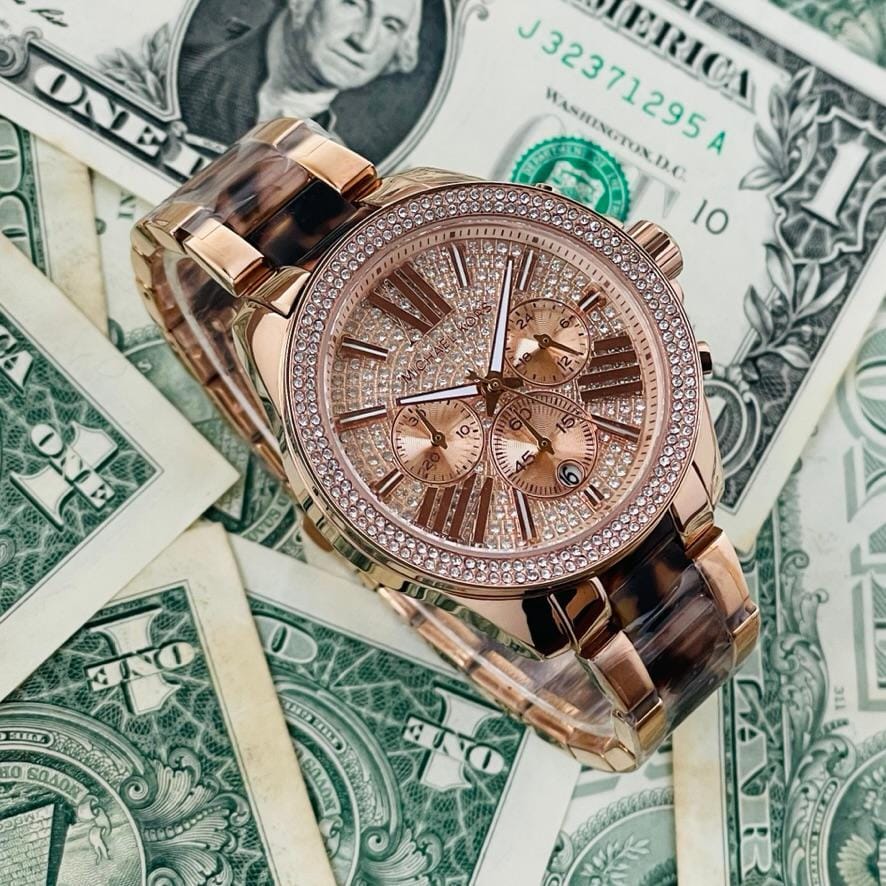 Chronograph - three sub-dials displaying: 60 second, 30 minute and 24 hour. Quartz movement. Scratch resistant mineral crystal. Pull / push crown. Solid case back. Case diameter: 42 mm. Case thickness: 13 mm. Round case shape. Band width: 20 mm. Band length: 7.45 inches. Deployment clasp. Water resistant at 100 meters / 330 feet. Casual watch style. Michael Kors Wren Chronograph Crystal Pave Dial Rose Gold-tone and Tortoise-shell Acetate Ladies Watch MK6159.