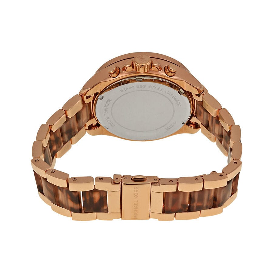 Rose gold-tone stainless steel case with a rose gold-tone stainless steel bracelet with tortoise-shell acetate center links. Fixed rose gold-tone bezel set with crystals. Rose crystal dial with rose gold-tone hands and index hour markers. Roman numerals mark the 4, 8 and 12 o'clock positions. Minute markers around the outer rim. Dial Type: Analog. Date display at the 6 o'clock position.