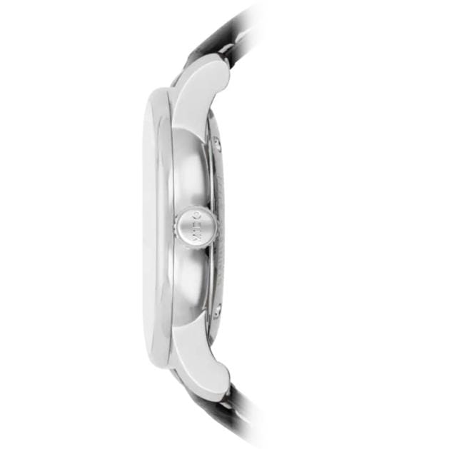 The elegant yet clear dial is protected by a sapphire crystal, which guarantees maximum resistance to scratches. The double-sided anti-reflective coating provides perfect legibility even in bright sunlight. The water resistance of this model is 50m (5 Bar), so it can handle basic contact with water, such as rain or showers.