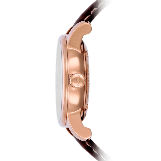 The Mido M8600.2.21.8 watch has a case made of 316L stainless steel with a rose gold PVD finish, which is suitably complemented by a leather strap. The case reliably ticks the Swiss mechanical movement Mido Caliber 80 (based on ETA C07.611) with automatic winding. It operates at a frequency of 21,600 semi-frequencies per hour, has 25 jewels and, above all, an extended power reserve of 80 hours. The operation of this machine can be observed through a transparent die. At the 4-5 o'clock position we find a practical date indicator.