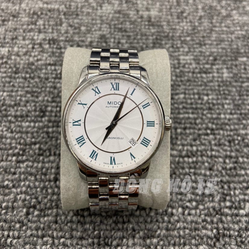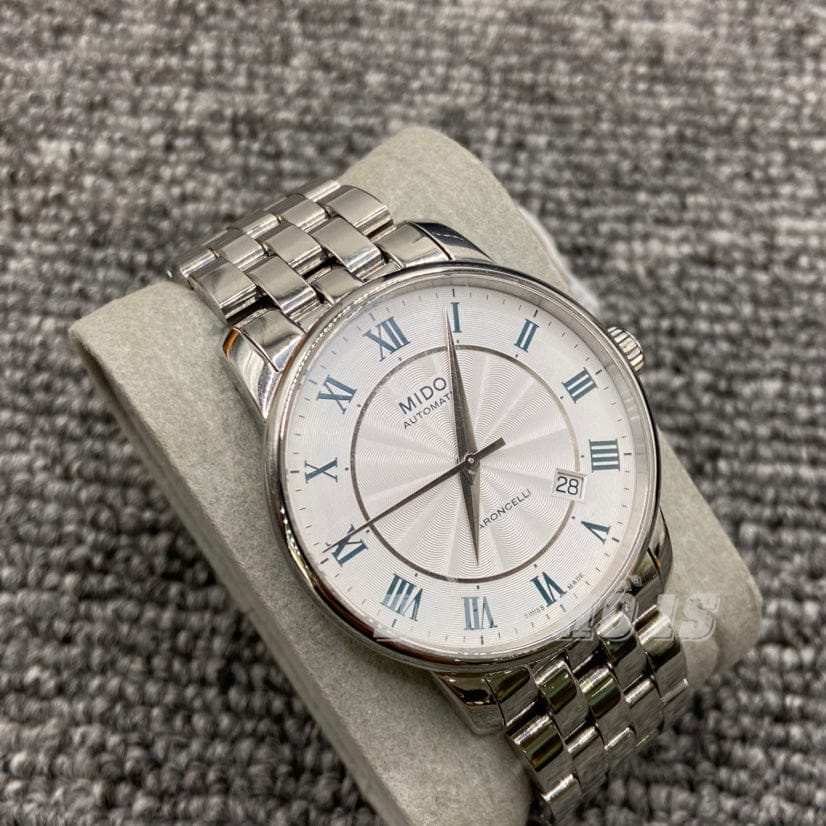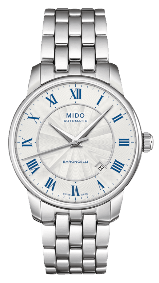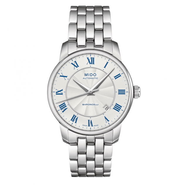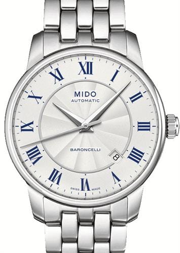 Mido Baroncelli II model M8600.4.21.1 powered by Swiss ETA 2824-2 automatic movement with date calendar. Stainless steel case with bracelet. Silver textured color dial with blue Arabic numerals.