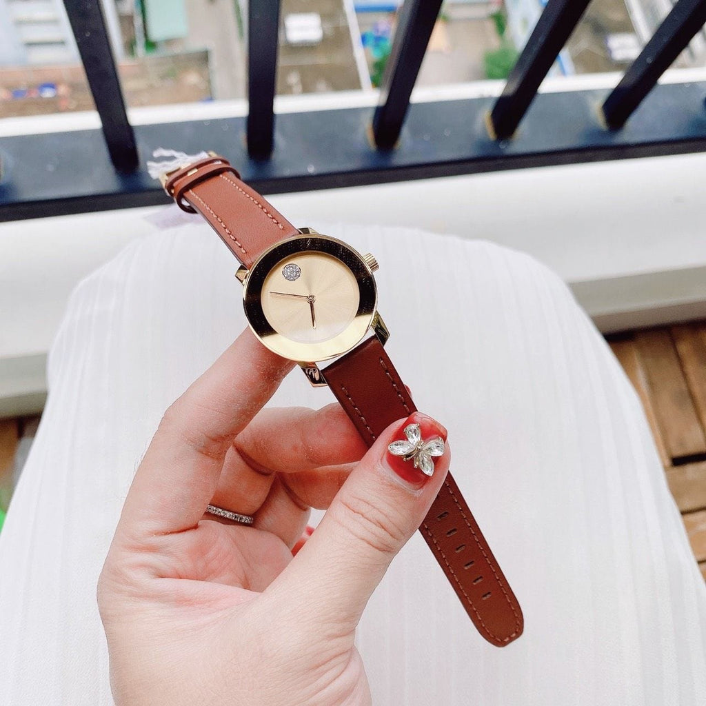 Brand New Authentic Movado Bold Gold Dial Brown Leather Strap Women's Watch Model 3600437. Stainless Steel case with Brown Leather strap. Tang clasp. Fixed bezel. Dial description: Yellow gold tone hands and Signature Movado Dot marking the 12 o'clock position on a Yellow Gold Toned Sunray dial. Yellow Gold dial. Battery Operated Quartz movement. Watch functions: Hour, Minute. Pull/Push crown. Round case shape. Case size: 30mm. Solid case back. 30 Meters - 100 Feet water resistant. 2 year warranty.