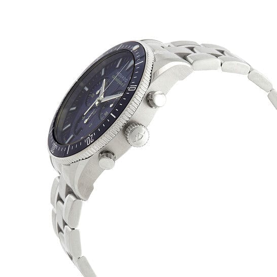 Silver-tone stainless steel case and bracelet. Uni-directional rotating silver-tone stainless steel bezel with a blue aluminum top ring. Blue dial with silver-tone hands and index hour markers. Minute markers around the outer rim. Dial Type: Analog. Luminescent hands and markers. Date display at the 6 o'clock position. Chronograph - three sub-dials displaying: 60 second, 30 minute and 12 hour.