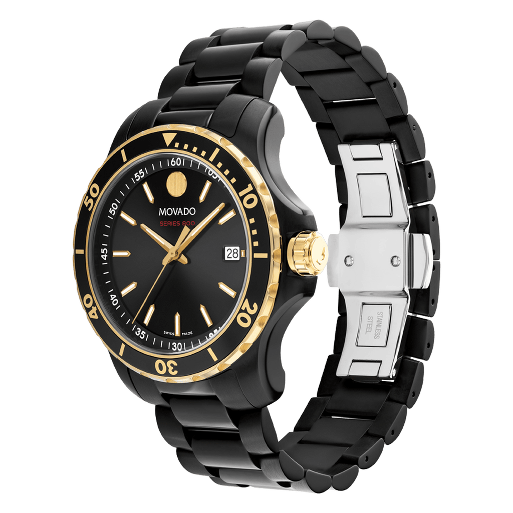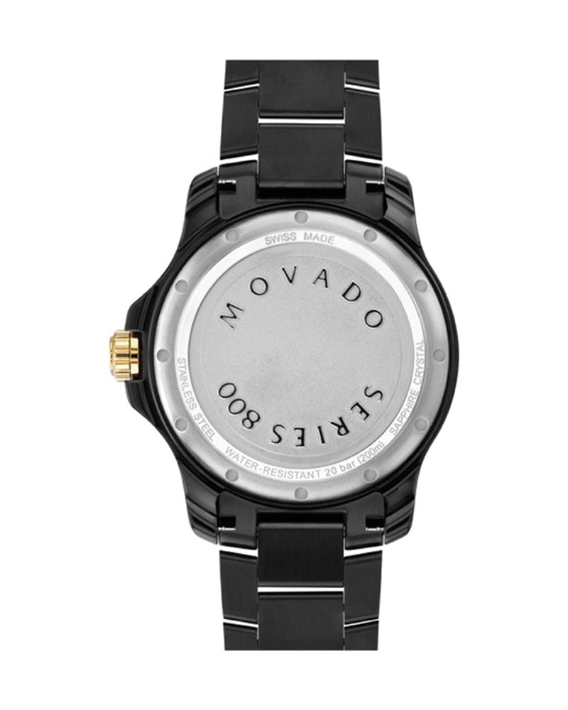 Boldness and sophistication merge seamlessly with the Movado Series 800 Gold & Black PVD Men's Watch, perfect for your collection. The watch pairs a striking gold-toned stainless steel case with a black PVD-finished bezel. This visual appeal is not just for you to show off; it signifies a watch built strong enough to endure. Perfect for your dynamic lifestyle, it complements both business attire and casual outfits with ease. The gold and black theme continues throughout, creating a design that captivates and is sure to hold other’s attention.
