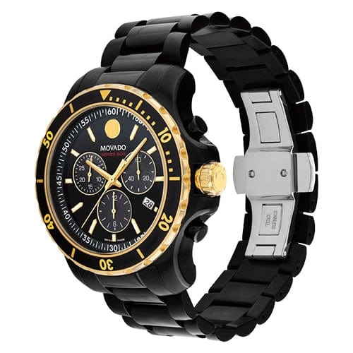 Experience elevated sporty style with a modern twist. In sleek black and shining gold, this chronograph makes a bold and stylish statement. The 42mm case showcases a sleek black dial with three subdials, Swiss Super-LumiNova® detailing on the hands and hour markers, a date window, and our iconic dot at 12 o’clock. Inspired by divers' watches, the unidirectional rotating bezel, screw-down crown, Series 800 caseback, and fluid bracelet complete this must-have design. Powered by quartz movement with water resistance up to 200 meters and a scratch-resistant sapphire crystal. Secured with a deployment clasp featuring a push button closure.